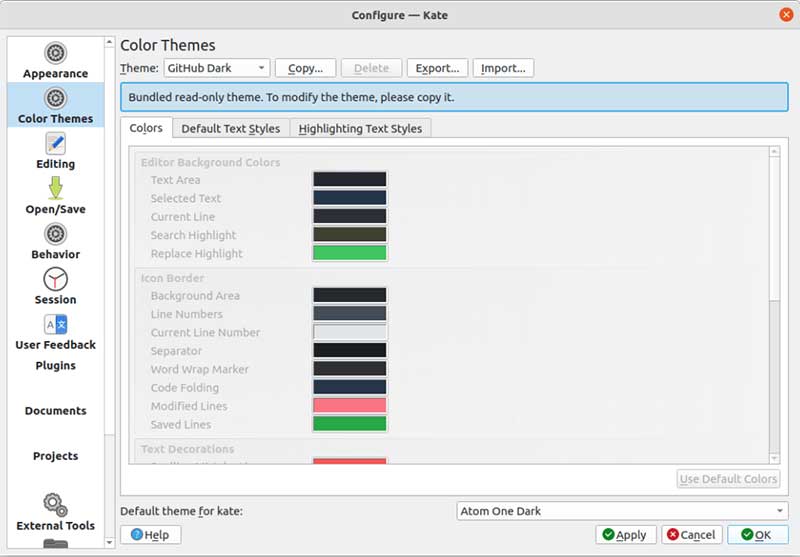 A good idea is to modify the default color scheme. By default, Kate Text Edit comes with a few color theme options.