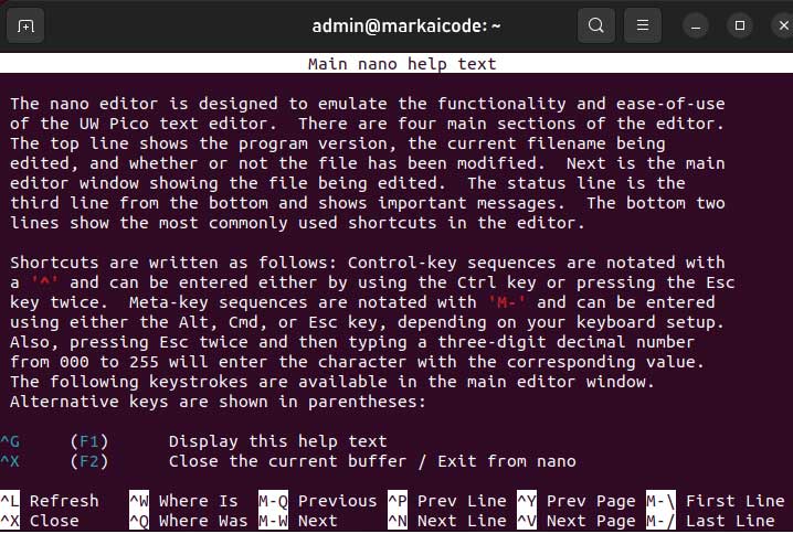 If you want to learn more about nano on Ubuntu 22.04, you can press “Ctrl+G” to access the help section.