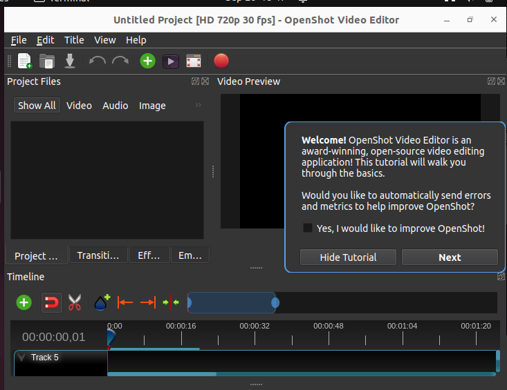 You may now interact with your installed OpenShot video editor to get acquainted with its interface and begin creating and editing movies.