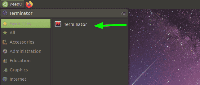 With Terminator installed, use the application menu to search it and launch it. In the standard GNOME environment, click on ‘Actvitities’ at the far left corner and type ‘Terminator’ to search it. To launch Terminator, click on the Terminator icon.