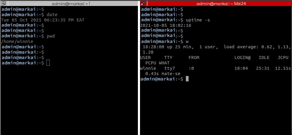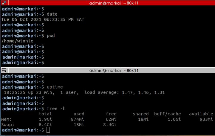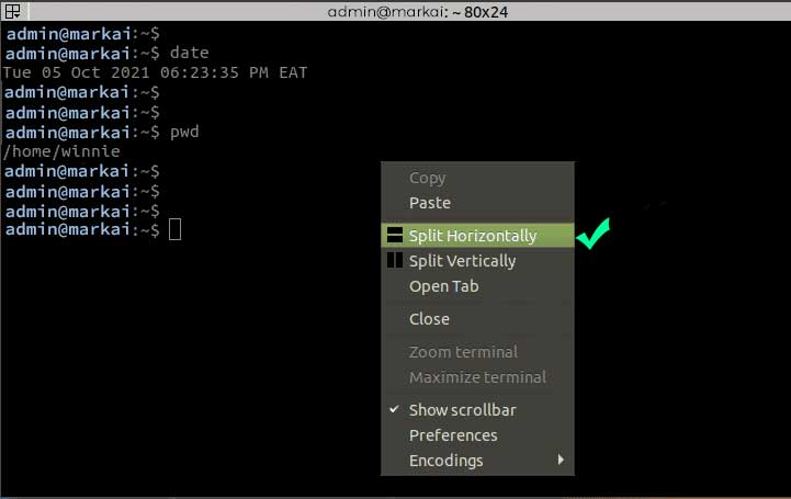 As discussed earlier, Terminator brings to the table some additional features that you cannot find on the standard terminal. For example, you can have a split screen terminal within the same window with one terminal stacked above. To achieve this, right-click anywhere within the terminal and select ‘Split horizontally’.