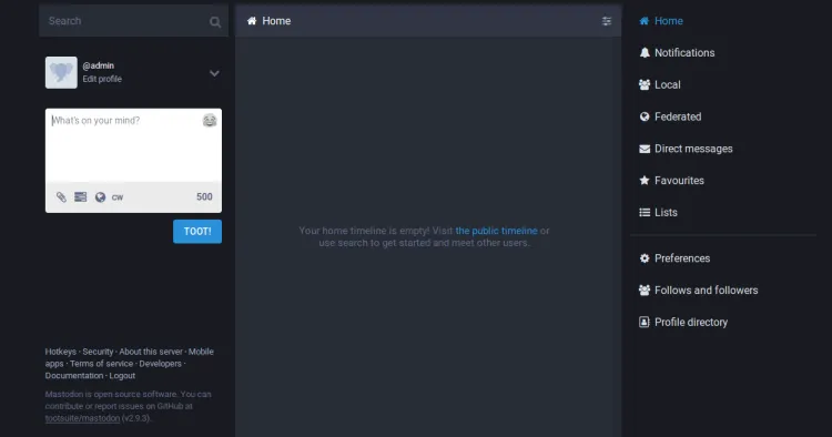 Now, click on the FINISH TUTORIAL! Button. You should see the Mastodon dashboard on the following page: